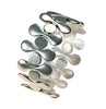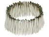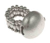 Flat round elements suspended between two rows of tiny round metal beads. One size only. Note: Elasticized rings must be removed for hand washing. Soap chemicals will break down elasticity.