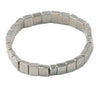 Smooth square shaped beads strung on elastic. Great on its own or in a stack with two or three other bracelets. Made of recycled mixed metals including silver, pewter and copper.
