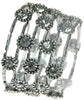 Crystal flowers and silver metal rice beads make a comfortable elastic cuff. Made of recycled mixed metals including silver, pewter and copper.