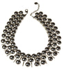 Large round, jeweled elements strung on elastic. Made of recycled mixed metals including silver, pewter and copper.