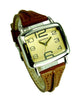 The soft aged leather band is handcrafted with pleat and stitch work. The vintage dial treatment and modernnumbers add a lot of character to a watch that can go beyond trends. Case dimension is 1". Available in brown, dark red, silver and black.