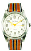Fun and sporty nylon striped band for women and men. Easy to read face with luminous glow in the dark dial. Case dimension is 1-1/2". Available in orange and green.